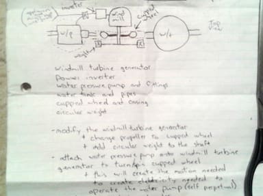 The pump takes the water from the tank and pushes it to turn the cupped wheel then the water returns to the tank, so it never runs out of water.The cupped wheel turns the turbine creating electricity to operate the pressure pump and have enough electricity to power other electric devices.