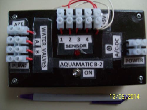 My Aquamatic Systems monitor the soil moisture in up to 4 locations and control the watering of the soil as needed. Sensors placed in the soil feed information to a controller operated by digital logic devices and determine amount of water to release.