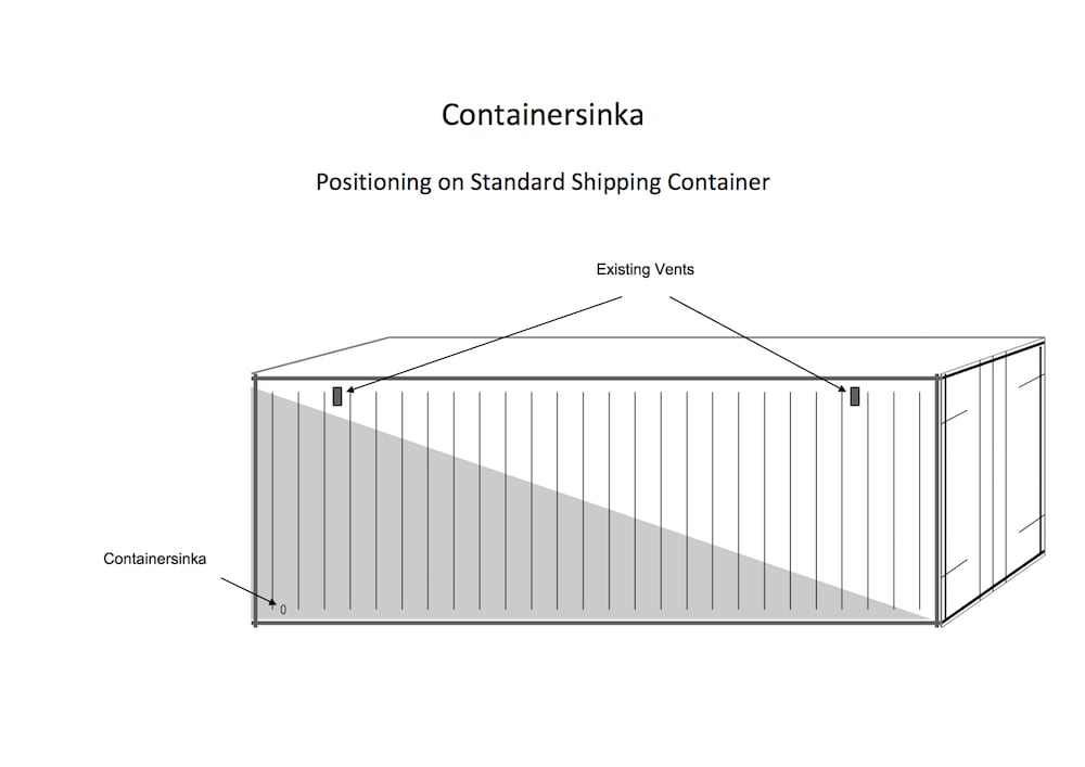 Just a little larger than a cigarette packet, Containersinka can be made of plastic (recycled/recyclable if required). It is totally maintenance free and self-resetting. There are no moving parts, it works by a patented system of airlocks and u-bends and is shaped and designed to be placed safely in the recessed “crinkle” of the container wall.