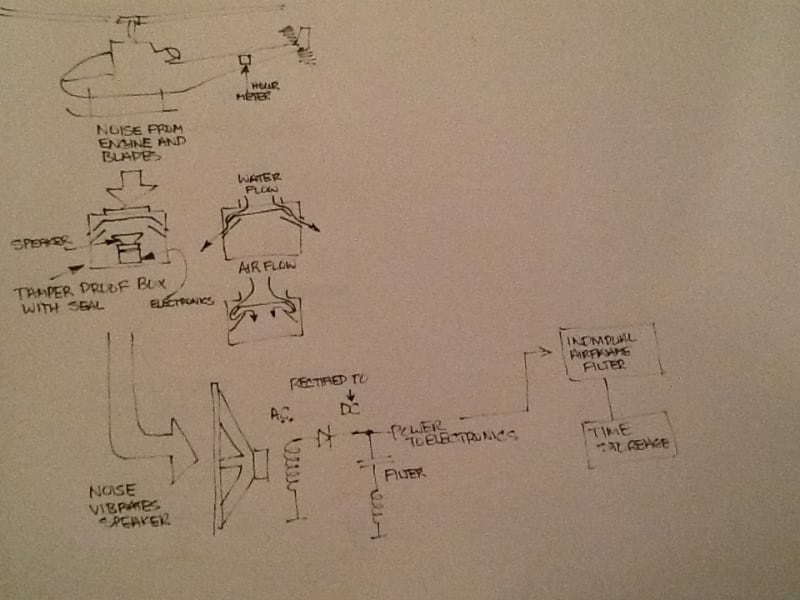 By allowing air pressure variations as noise to enter the enclosure ( which could only be opened by officials by breaking the seal) they act on a conventional cone type speaker of any conventional impendence (8-16ohm). Once the motor starts and the rotors start to generate lift the noise of both act to vibrate the speaker come in sympathy. The alternating current output of the speakers coil is passes through semiconductor rectifiers to generate DC which powers the electronics involved in the circuit. Once the noise starts and the blades generate thrust, the circuit can ' read' the frequencies involved and therefore make the electricity generation specific to the particular aircraft by active electronic filtering. The total 'on' time being stored in memory. When two or more aircraft are operated simultaneously in close proximity to each other they can be seperated by the simple means of placing the complete unit on another place on the helicopter( which changes the resonance and can be tuned and read by the electronic filter adjustment).