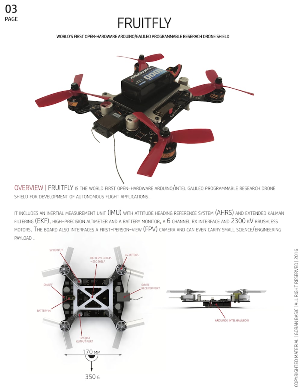 FRUITFLY is an open-hardware programmable research micro-drone printed circuit board for developing programmable and intelligent autonomous drone applications. It comes in a ready-to-fly kit and is primarily designed for Arduino/Intel Galileo environment. This low-cost platform is heavily focused on developing programming skills and drone technology expertise.