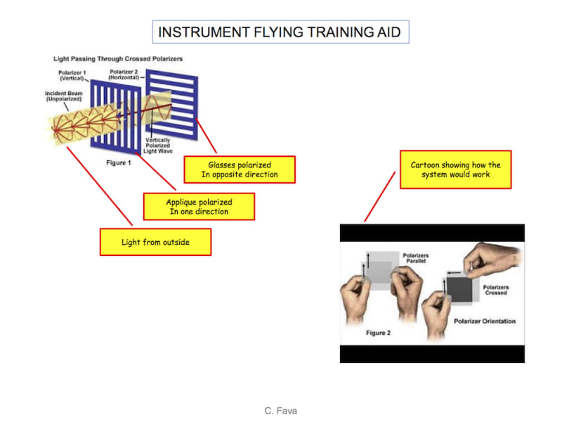Since the film applique and the glasses are purposely polarized in opposite directions, when the glasses and only when the glasses are donned, the student pilot cannot see outside the front windscreen, simulating IFR conditions.