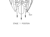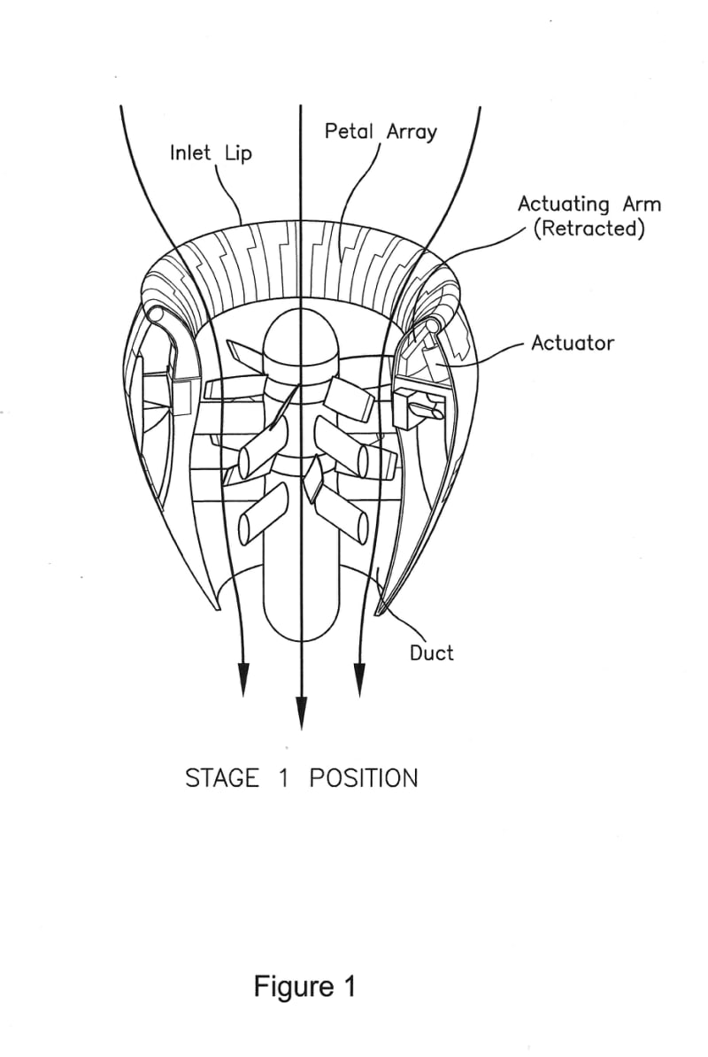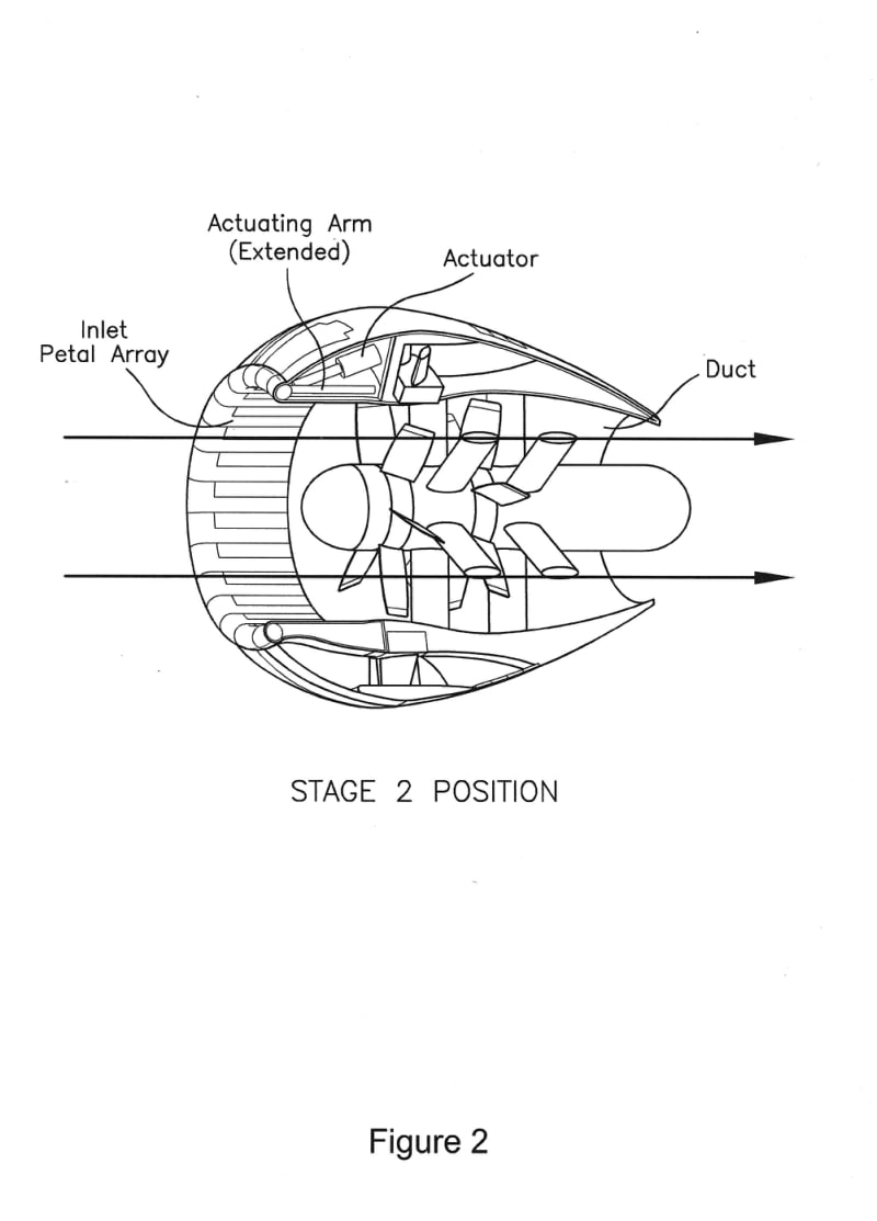 The Stage 1 position, shown in Figure 1 illustrates the adjustable size inlet system with the ducted fan tilted vertically and an adjustable size inlet with a plurality of overlapping inlet petals interconnected to form a continuous ring structure around the perimeter of ASIS. Actuation arms are connected to pull-push actuators that when retracted causes the solid hub to move in a downward direction causing a curvature of the overlapping inlet petal array, resulting in the bellmouth contour of the ASIS associated with Stage 1 position.