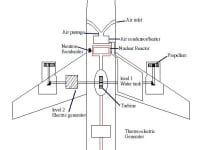 The nuclear reactor is thermally insulated on 5 sides except for one side which is connected to air heater. the fission is controlled and safety devices like leak sensor, temperature sensor is placed at various places and is connected to a central control system. the heat from fission is used for water generation as well as to generates steam which drives the turbine. the generators extract electricity from mechanical motion of turbine shaft and thermoelectric generators use heat of output steam to generate electricity which is used to drive electrical devices and actuators.