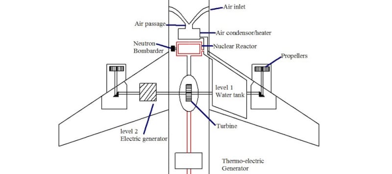 The nuclear fission is performed on a low weight radioactive material like Iodine. The heat so released is used to convert water into steam, which in turn drives the turbine. the water is stored initially in water tank which is at level 1 in the plane, and later is generated by heating air to turn water vapor to water. the fission is controlled according to power demand. the turbine converts steam pressure energy to mechanical energy. this is directed towards the propellers by means of gears and transmission devices. there is an electric generator placed in level 2 which extracts electricity from mechanical rotations of turbine shaft.