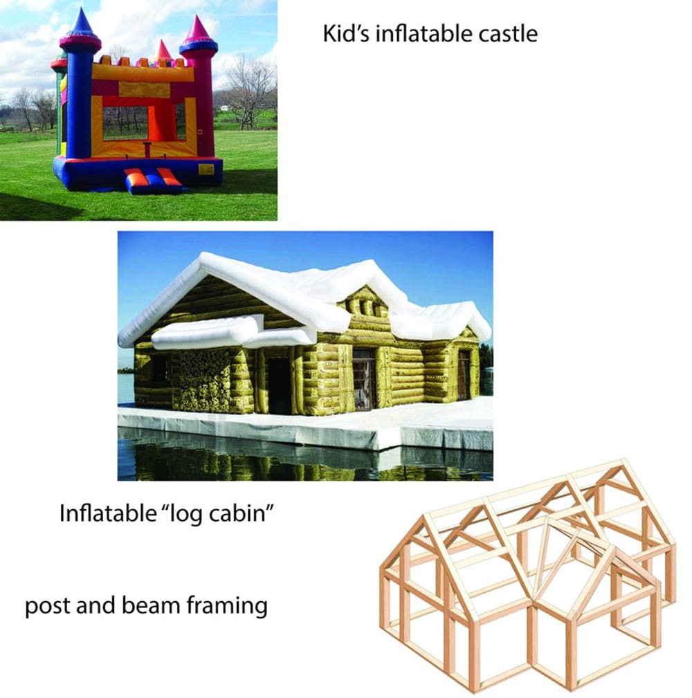 Inflatable structures use an inflated spine to form the shape with plastic walls. More complex structures also are inflatable, like tents, displays or even football field sized event buildings. All inflate using low pressure air (5-12 psi). None are intended as long term structures and all depend on maintaining air pressure to stay erect.