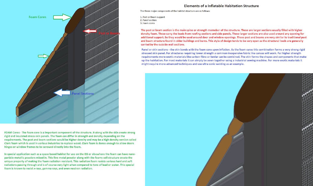 To get rid of the air pressure system we use expanding rigid urethane foam. This is commonly used as spray insulation in homes. This foam can be mixed in various densities and strengths up to those that mimic real wood properties (Clark foam). We can mix metallic nano-powders into the foam and have radiation safe habitats for use in space.