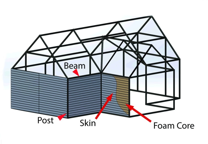 The basic structure is posts and planks. These fill with the expanding foam to form a solid structure that resembles a log cabin. The foam core and skin form very strong stressed skin panels that are very durable, and well insulated. It could incorporate wiring and led lighting right into the structure if desired. For temporary dwelling plastic windows and fabric doors work. For a permanent structure the high density Clark foam lets builders screw hinges or window frames into place to use standard windows and doors.