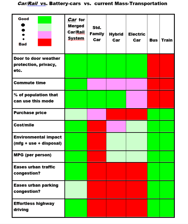 The Car part of the system can be a battery-car (which, as a part of this system, makes sense) or even a ICE car. It can be used as a car around town or it can even be driven cross-country if need be. It weighs one ton, seats four and is 5½ feet wide and 10½ feet long (e.g., a "stretched" smart Car), however since its wheelbase is made to fit onto the Railcar it can piggyback wherever the System is or becomes, available. That is, in a nutshell, the crux of the System.
