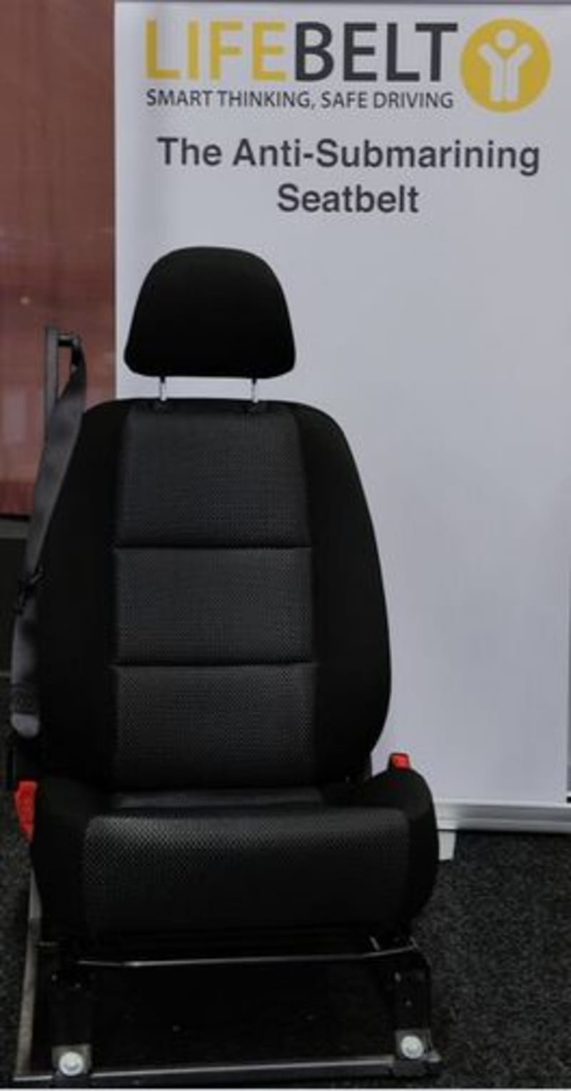 Lifebelt is a webbing strap placed in the seat base, just below the seating surface, which is continuous with the standard seat belt and is therefore loaded when the seat belt loads. Its effect is to form a loop around the upper leg area which encloses the pelvis and prevents submarining. It can be located close to the seat surface and therefore engages very early compared to the seat pan providing superior control of adult occupants of the full range and no need for a pretensioner *.