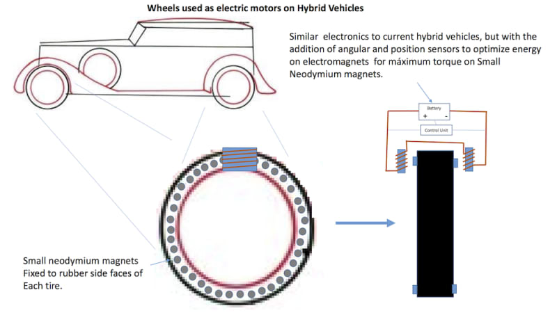 Proposed Idea uses the wheels as electric motor rotor. Multiple tiny neodymium magnets are added to the lateral faces of the vehicle tires. And small static electromagnets are used to convert electricity into torque.