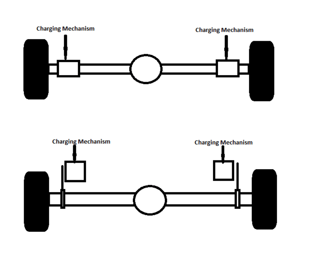 This design is to add alternators or a charging mechanism to the axles of electric or hybrid vehicles, so that all four wheels can contribute to the system battery charging when moving. The alternators or charging mechanisms could either be designed as part of the axle or used with a belt or chain/drive system as separate pieces.