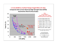 CarTech Temper Tough®-HD and –LN Alloys are high strength, high ductility quenched and tempered sheet and strip steels which exhibit superior combinations of UTS and EL over other AHSS alloys and the DOE Targets for 3rd GEN AHSS as shown in the attached graph and table. Temper Tough-LN contains lower alloy content and therefore costs less than Temper Tough-HD alloy. US and foreign patents are pending for both alloys which have been produced as strip from 40 ton (36.3 metric tons) continuous cast heats.