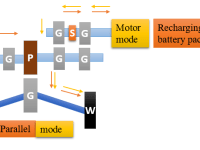 This invention uses planetary gear set and compound gears along with shifting mechanism to couple an engine and a motor in such a way that three modes- Engine only with regeneration mode, motor only mode and parallel mode are achieved. In the Engine only mode, the engine alone powers the vehicle while at the same time charges the battery pack by giving rotation to the motor in opposite direction making it to work as an alternator. The engine powers the planetary carrier, which in-turn rotates the ring gear, which is the output gear in all the modes. On the other side the shifting mechanism engages with the gear on the hollow shaft for regeneration. The reduction is applied to provide correct speed to the motor shaft. Sun shaft is kept stationary by the ratchet & pawl mechanism. In Motor only mode the motor alone provides the motive force for the car to move. The Motor powers the gear through the switching mechanism which is shifted to engage with the sun shaft. This gives rotation to the sun gear through the solid shaft, and hence the ring gear. Hollow shaft is kept stationary by the ratchet & pawl mechanism. In the Parallel mode, both the planetary carrier and the sun gear get rotation from engine and motor respectively but in opposite directions. This sums up power from both the machines. The shifter is in same position as in the motor only mode. This mode gives higher torque output and top speed. The inherent nature of the planetary gear set allows this coupling.