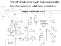 1. Any classic hybrid hydraulic system has a significant handicap: steel accumulators, albeit being much cheaper than electrical batteries, last forever and create no heat, can weigh more than fifty (50) times the weight of a lead-acid battery per unit of stored energy. As a result, all or most, accumulators used for present hybrid hydraulic applications are quite expensive, small, made of fiber, for high pressure and may be usable only for short cycles, mainly for brake energy recuperation and release. Replacing the frame with a steel accumulator makes now a Hydraulic accumulator figuratively weightless, on top of cutting the prime mover dimension substantially, as well as cutting down or eliminating many parts.