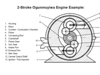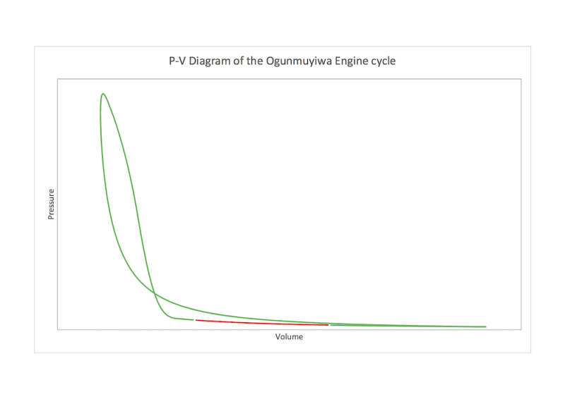 The P-V diagram of the Ogunmuyiwa Engine Cycle illustrates the benefits of this cycle over the Otto and Diesel engine cycles. While the work performed on the expansion stroke is still positive, the Ogunmuyiwa Engine Cycle also has significant parts of the compression stroke (at the beginning and the end) where additional positive work is performed. The negative work requirement on the system is therefore limited to the middle part of the compression stroke. This process offers a significant advantage over the Otto and Diesel engine cycles, which have a negative work requirement over the complete compression stroke. This results in the Ogunmuyiwa Engine Cycle achieving a significantly higher thermal efficiency than the Otto and Diesel engine cycles.