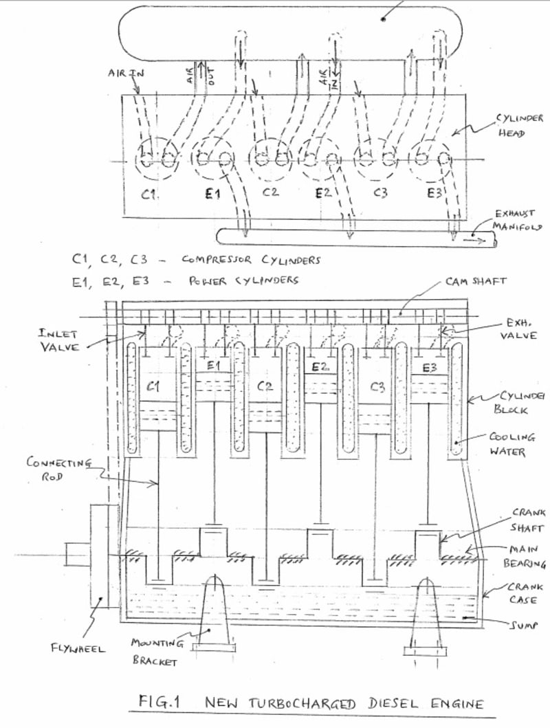 In this engine some of the cylinders function as reciprocating compressors while others act as power producing cylinders . Fig.1 depicts a typical arrangement for a six-cylinder inline engine. In this six cylinder engine , 3 alternate cylinders function as reciprocating compressor ( C1,C2,C3) and three as power producing cylinders ( E1,E2,E3) .The three cylinders are phased at 120 degrees with respect to their stroke positions in order to have symmetry / uniformity of output and pressures .The preferred firing order is E1-E3-E2. When the piston of E1 is at TDC, the piston of C3 is at BDC i.e when E1 is about to fire, C3 is about to compress the air. The compressed air output from cylinders C1,C2 and C3 are connected to an air receiver of suitable capacity.The three power cylinders draw their inlet air from the air receiver operating at higher pressures and hence the peak cylinder pressures will also be high.