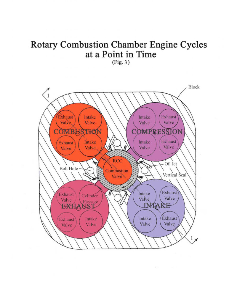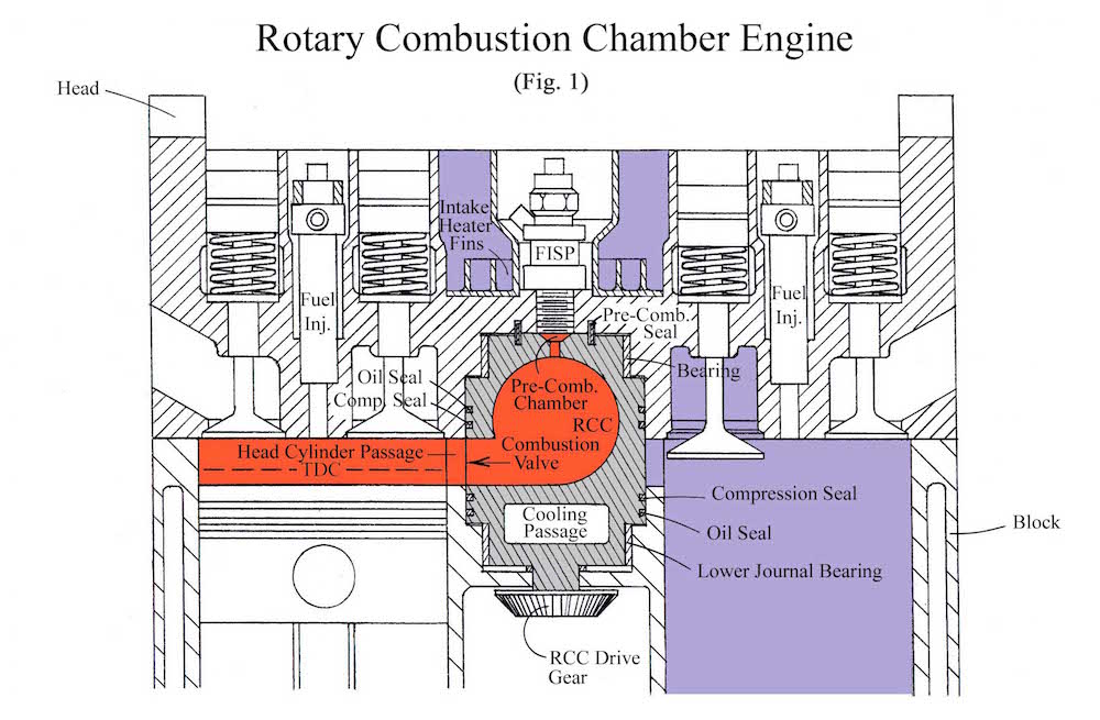 In operation, a heat exchanger heats the intake air from residual exhaust heat. Next, a supercharger (not shown) forces air into the intake manifold. The charge is further heated by fins located in the intake passage before it enters the cylinder. A small amount of preheated fuel is injected into the cylinder during compression before the combustion valve opens late in the compression cycle. Compression pressure causes half of the very lean mixture to quickly enter the RCC while additional fuel is injected into it to produce almost immediate and thorough mixing of the charge. The residual rich mixture in the pre-combustion chamber caused by restricted access to the incoming compression charge is ignited by the combination spark plug fuel injector (FISP) and the resulting combustion jet ignites the RCC charge. The pressure rise created by the RCC ignition (combustion pressure ignition) or jet ignites the cylinder charge providing power to the piston. After most of the charge has been transferred to the cylinder, the combustion valve closes while rotating to the next cylinder to repeat the process. Finally, heat from the exhaust charge is added to the intake air via a heat exchanger as the exhaust exits through the head.