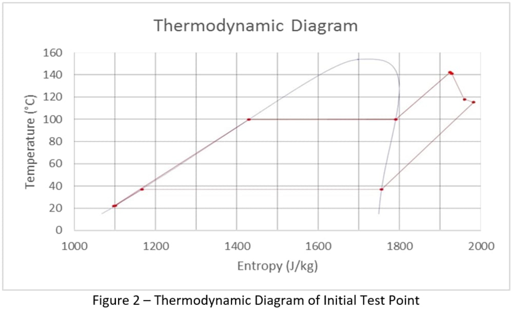 Results: An initial test point was conducted to determine what the testing facility was capable of, figure 2 shows the T-s diagram from the investigation. The diagram shows excessive subcooling and superheating that was later found to be unnecessary and reduced the system efficiency. A number of improvements were made to the system to try to remove the pressure loss and as the parametric swings were conducted the components were understood so that the system could be correctly tuned. This highlighted the significance of the pipework and showed that it should have a similar level of importance to the component selection. A number of important points were also raised about correct testing facility instrumentation. By removing the high levels of subcooling and superheating along with installing a recuperator into the system huge improvements were observed. Figure 3 shows the difference between the initial testing point and the improved testing point.