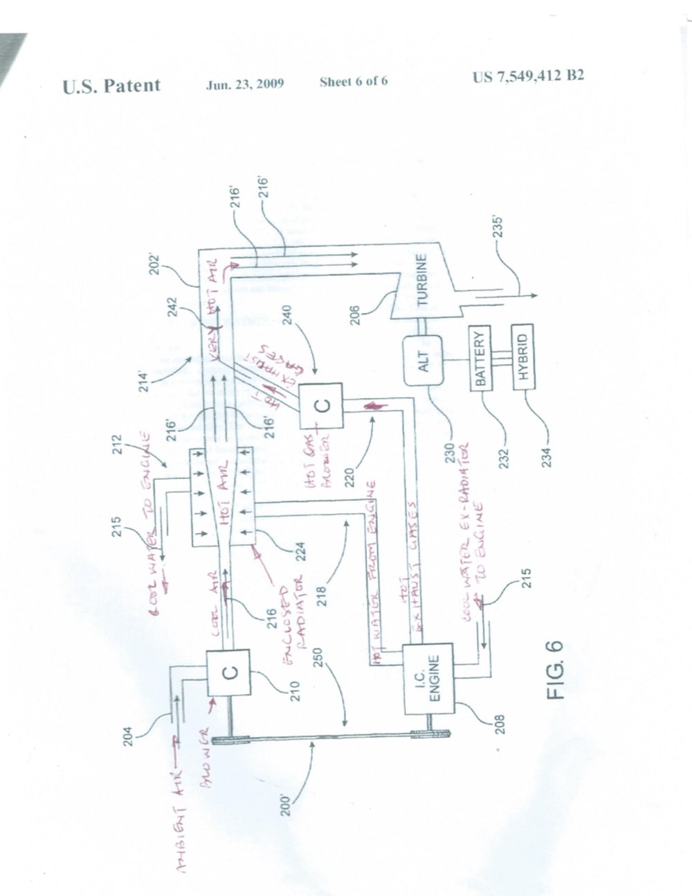 Referring to Fig6, a blower/compressor (210) driven by the engine blows ambient air through the enclosed radiator 224, where hot water from the engine is cooled and returned to the engine and the air used will now absorb heat and goes to another stage where it is mixed with the hot exhaust gases and absorbs more heat and expands to a very large volume and then drives a much larger turbine 206 than the turbocharger, which then drives a much larger alternator 230, which will continuously supply additional power to the hybrid system. Part of the energy used to power the compressor is recovered in the exhaust turbine.