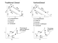 Thermodynamic curves shown in the second figure compare this new engine design to a traditional diesel. The Pressure-Volume (P-V) curves are at the top. The area enclosed by the P-V curve is proportional to the engine’s net power. The area of the YankeeDiesel is larger because the power stroke is extended by the additional expansion. The Temperature-Entropy (T-S) diagram is another efficiency indicator. The YankeeDiesel’s lower exhaust temperature means that less heat is exhausted and more mechanical power is produced. The thermodynamic state analysis was done using algorithms in www.thermofluids.net