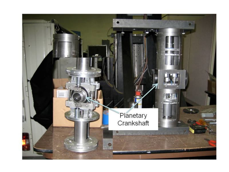 A traditional crankshaft with connecting rods would prevent opposed cylinders from helping each other. This new design required a planetary crankshaft which eliminated the connecting rods and a separate camshaft. A partially assembled model of a four cylinder engine is shown in the third figure. The supercharger and secondary expansion chamber are coupled together with the planetary crankshaft as shown with the insert in that figure. The design has progressed through several iterations; details can be seen at http://www.yankeediesel.com