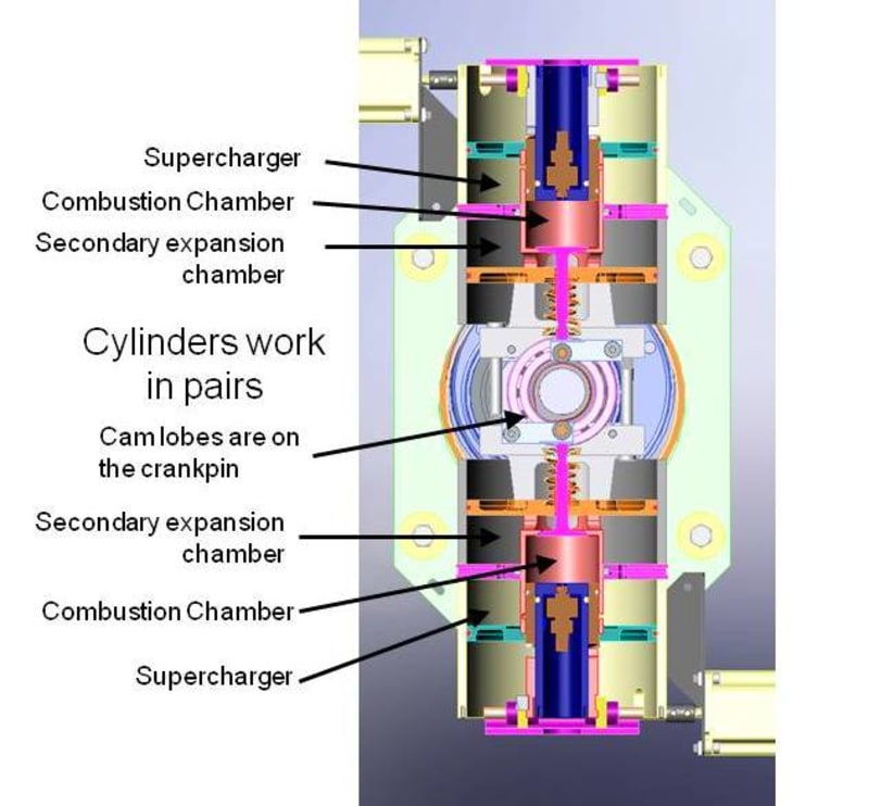 Here is how it works. The first figure shows a pair of cylinders. Near the end of the power stroke, combustion gases are released to the secondary expansion chamber. A single large valve at the bottom of the combustion chamber allows this. The continued expansion pushes a piston that is directly connected to the opposite cylinder’s supercharger. That supercharger is compressing. At the end of the stroke, the gases in the secondary expansion chamber are cooler and at lower pressure. The gases are cooler because some of its heat has been converted into extra power. The lower pressure reduces the exhaust noise.