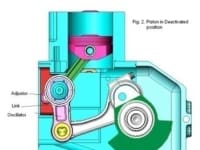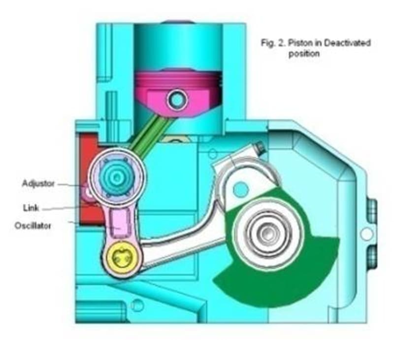 By rotating the adjustor relative to the oscillator, the lower pin of the piston conrod is positioned to be concentric with rotational axis of the oscillator and the piston motion is reduced to zero while the closed oscillating mechanism remains in sync with the crankshaft at all times. Activation and deactivation can be achieved very quickly in response to vehicle demand with a helical spline actuator (not shown). See Fig 2.