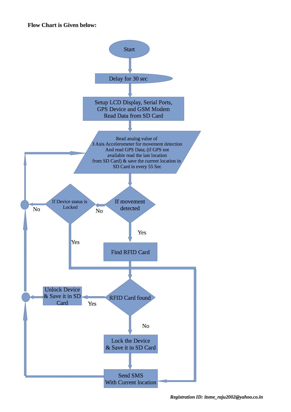 In case of unauthorized accesses, thieves will accesses the vehicle with duplicate key or sum other way, but he have not any RF ID Card. So at that time any movement of the vehicle sense the device by using 3 axis accelerometer, then device will locate the current location by using GPS Device and send the SMS alert to owner mobile phone with current location i.e. longitude and latitude with out any knowledge to thieves. If owner mobile is Android smart phone, it will show the current location in Google map. After that device will send the update of current location in every 2 minutes.