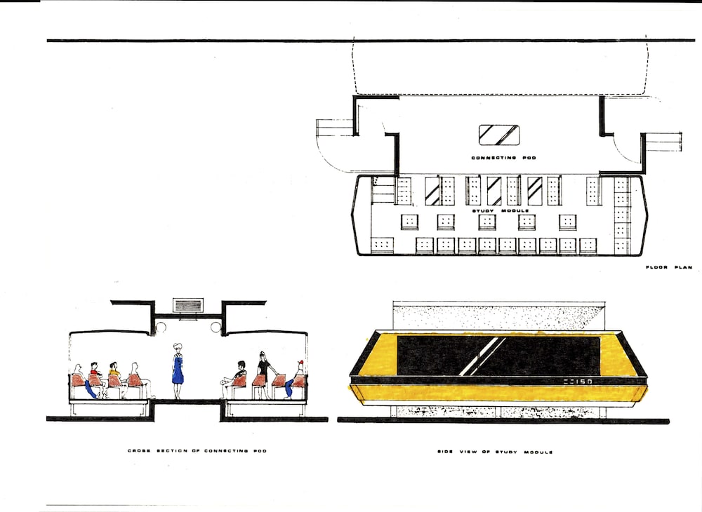 The concept of the Mobile Learning Module is formed to provide another possibility in the creative management of time and functions in the educational environment. In addition to the utilization of M.L.M. in the school district’s transportation strategies for student movement, the modules also provide usable instruction space at the individual school sites. This is achieved by specially designed connecting pods where the modules are attached to the pods. This arrangement forms air conditioned seating areas facing a central teaching station. Educational Broadband Service (EBS) connections would be provided with both the school building and the district’s remote learning studio.