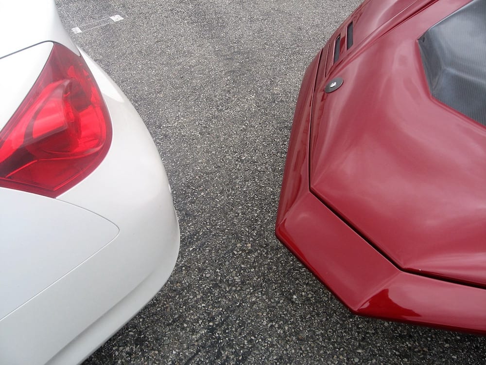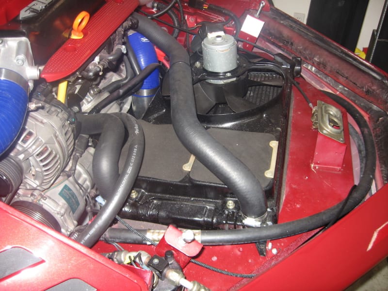 Due to the sharp angles on the front of the car, in order to be Crash Avoiding, a number of alterations were necessary to allow for the sleek front end. Both the hood and underside of the nose are dramatically pointed to allow for Crash Avoiding front end. The radiator, the fan and the A/C Condenser had to be mounted almost parallel with the ground. A large opening in the underside of the nose provides air intake for the radiator and A/C condenser.