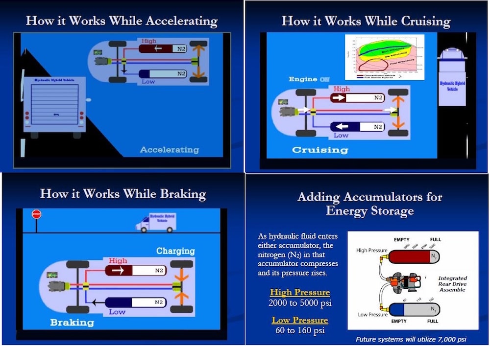 These three components work together, but to get things started, they need energy. That energy is gathered through regenerative braking. Kinetic energy from the brakes powers the pump. As the vehicle slows, the pump is activated, and moves fluid from the reservoir to the accumulator. As pressure in the accumulator builds, the accumulator sends its energy (in the form of nitrogen gas) directly to the driveshaft. As that happens, the vehicle accelerates, and the pump moves the fluid back to the reservoir, ready to charge the accumulator again.