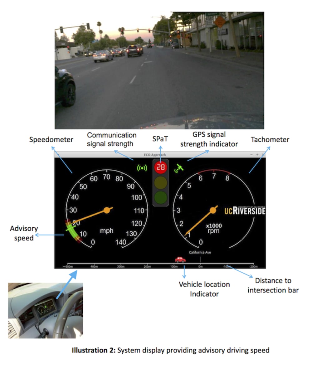 Nearly 7 billion hours of delay and more than 3 billion gallons of fuel were wasted in 2015 due to traffic congestion in the U.S., a significant portion of which is due to delays at traffic signals. Researchers at the University of California at Riverside, the Federal Highway Administration, and Leidos, Inc. have developed “GlidePath”, an intelligent driver assistance system that uses signal phase and timing information (SPaT) from upcoming traffic signals to determine the best driving speed profile to pass through the intersections.