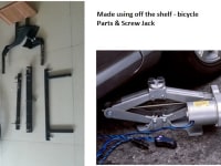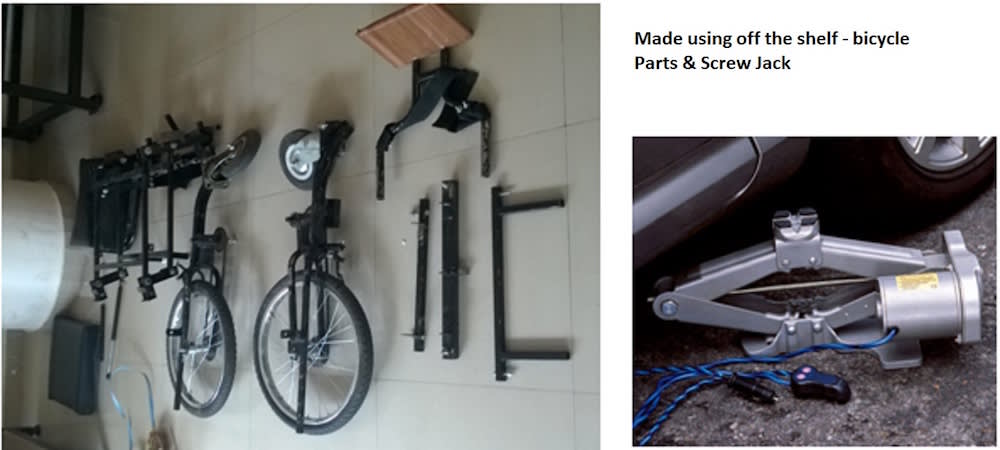 Manufactured using off the shelf parts (Mostly Bicycle Parts + Car Screw Jack) – Helps in keeping costs low, Bicycle Parts and Car Screw jack available everywhere and can be repaired by any roadside mechanic.
