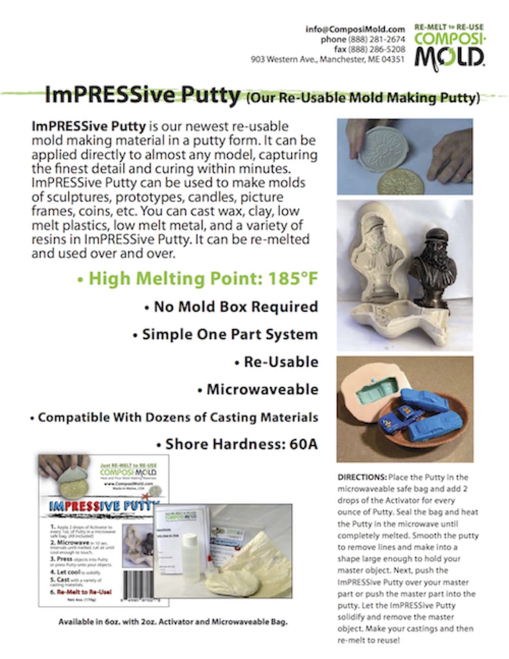 Impressive Putty is the easiest, safest, and most affordable mold making material in the world. Take almost any shape, made from clay, or printed on a 3-D printer. Press the Putty mold making materials over it, and you are ready to duplicate your part into plastic, concrete, soap, wax, and more. And unlike a 3-D printer, it doesn’t require any computer programming.