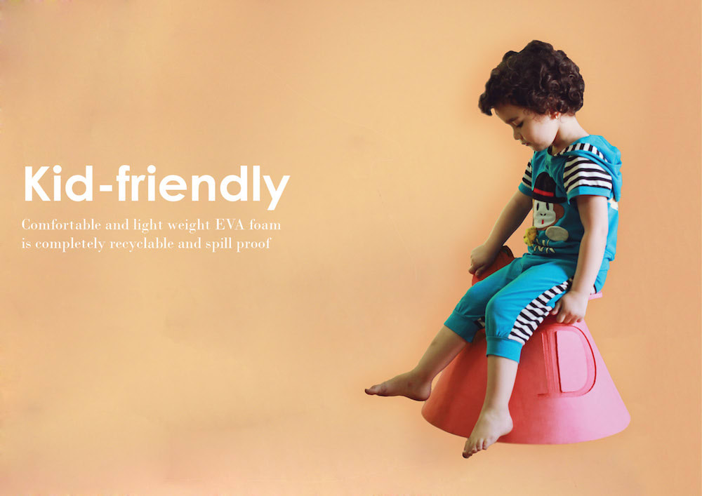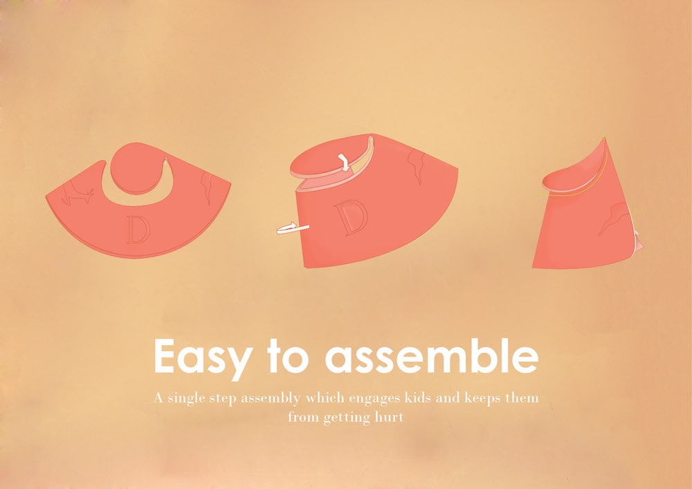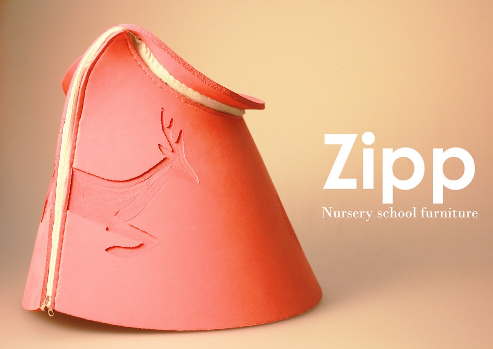 The foldable kids’ furniture one encounters in playschools are typically miniatures of the adult versions. Their hard surfaces, complex assembly and awkward bulk render them inappropriate, if not dangerous for children. A colourful range of ?at-pack EVA foam seating, called ‘ZIPP’, addresses this with remarkable ?air. A single foam sheet is smartly cut, folded and fastened with a zipper, whose seam gives it enough stiffness to take the weight of a small child. The material is also excellent for embossing, a way to introduce graphics on to the product. Zipp is a beautiful example of frugal, simple, intelligent design.