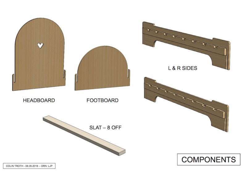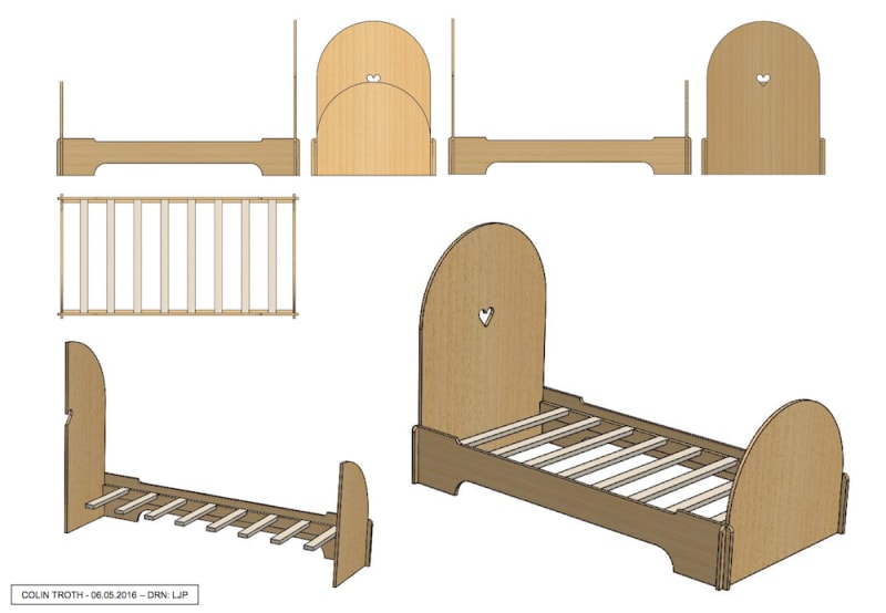 I propose a simple bed design that involves no fixtures whatsoever. It simply involves 50/50 slots. It can be assembled in minutes by anyone with minimal skills/ability. It also lends itself to simply flat packing.