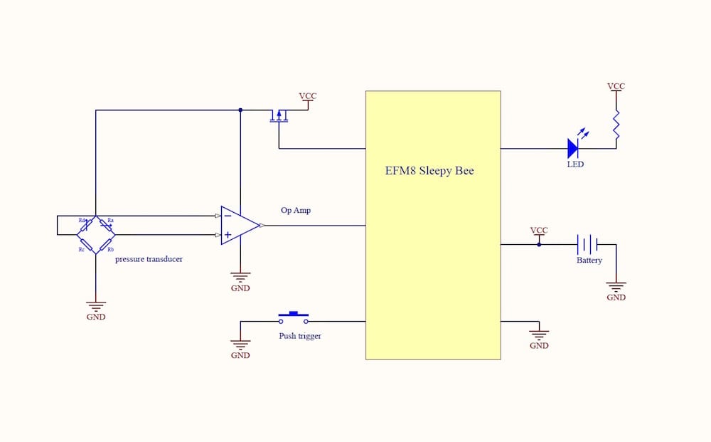 The product is a small pressure sensor for tires, built with a tiny MCU with low cost and ultra-low power consumption, such as the Silicon Labs EFM8 Sleepy Bee microcontroller. Due to the small 3mm by 3mm size of the MCU, the entire circuit, including the small pressure sensor and the tiny watch battery, can be embedded in a tire valve cap (Fig. 1). The MCU’s ultra-low power consumption allows the device to run for years without needing to change the tiny watch battery. The MCU’s built-in rich analog peripherals can easily interface with a pressure sensor, and the on-chip temperature sensor can be used to collect the air temperature. The high current sink capability of the GPIO pins can directly drive the LEDs (Fig. 2).