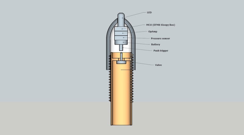 To check the pressure, simply press down on the cap. A mechanical pin pushes the air pressure valve down slightly, releasing a small amount of air into the sealed cap’s internal space. The press also triggers the microcontroller to power on the pressure sensor circuit and to sample the air pressure.