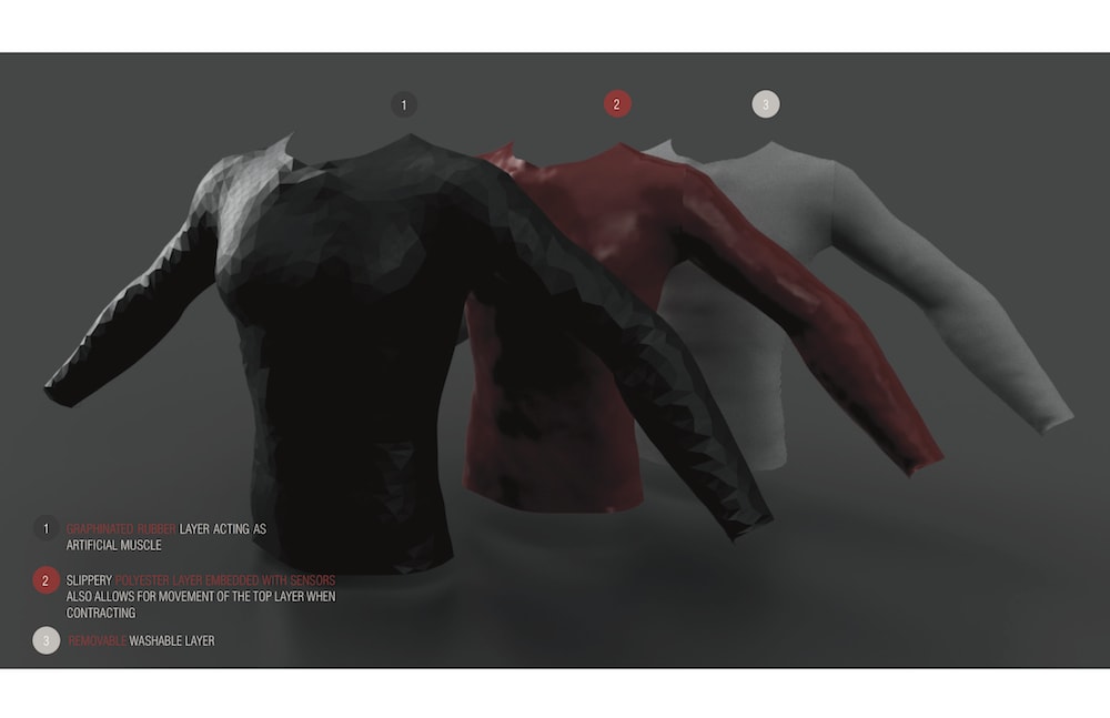 The MYO is a body correction/exo shirt that uses a graphinated rubber layer to simulate the way organic muscle works in order to help people in a domestic environment lift heavier objects without the risk of injury.