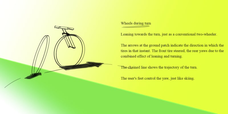 The rear wheel and the chain drive (or belt drive for that matter) are integral and connected indirectly to the rest of the body. This allows the rear wheel to rotate along Z-axis. This rotation (better understood through illustration) thrusts the bicycle in the turn with respect to an instantaneous center closer when compared to a conventional bicycle.
