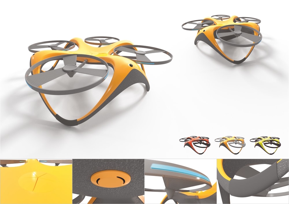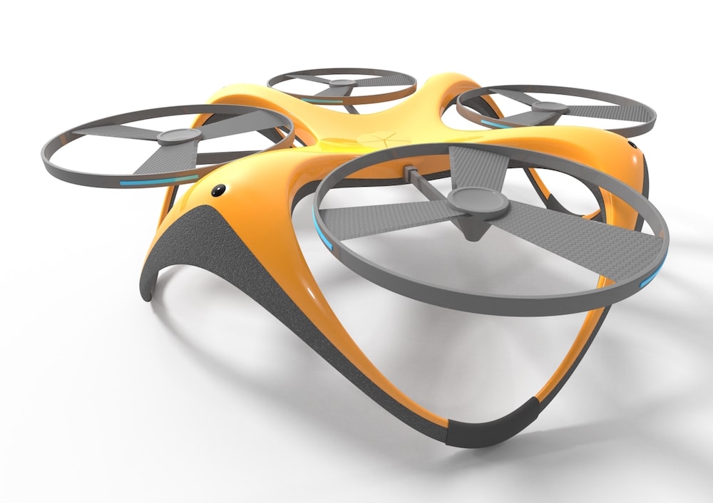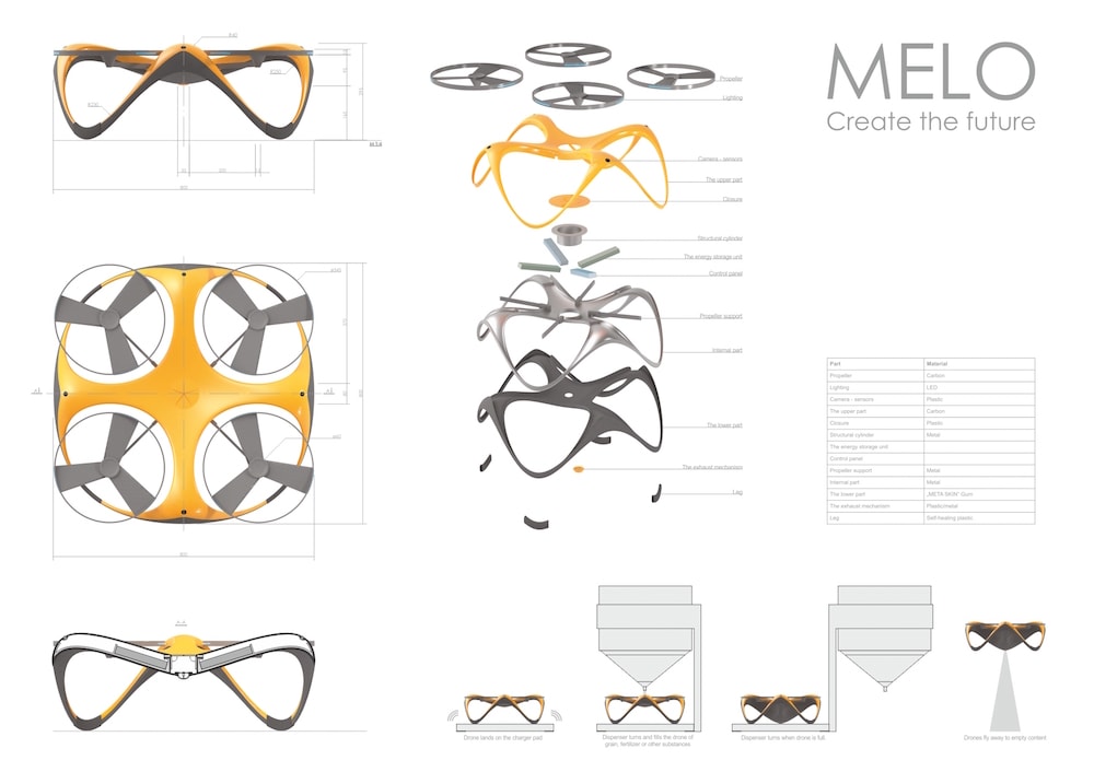 This drone can sow grain and spray fertilizers. The lower part of the design is made of stretchy and solid material „META SKIN“.