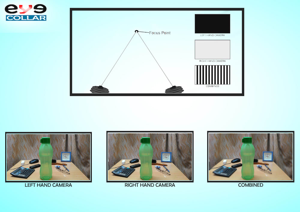 There are two front moveable cameras. The movement of the camera is done in solid angle of 120 degrees by DC motors through screw turning mechanism. The each camera is equipped with a gyroscope and accelerometer. The direction of the camera is guided by the laser sensor through CMOS similarly as laser mouse does. This is attached at the back of neck and tracks the movement. Therefore the collar captures the movement that you may see in front of you.