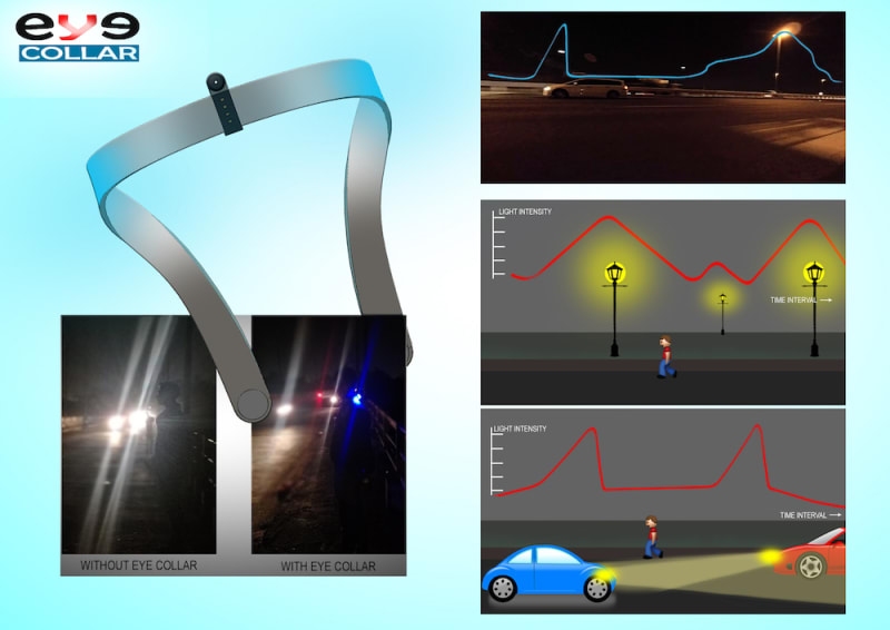 Eye collar is equipped with backlight which gets on during traffic. Inbuilt LDR tracks the frequency of the light during night to know if he is in traffic and detects if the person could become unseen for the drivers due to headlights. When such situations arise the backlight gets on to make him visible.