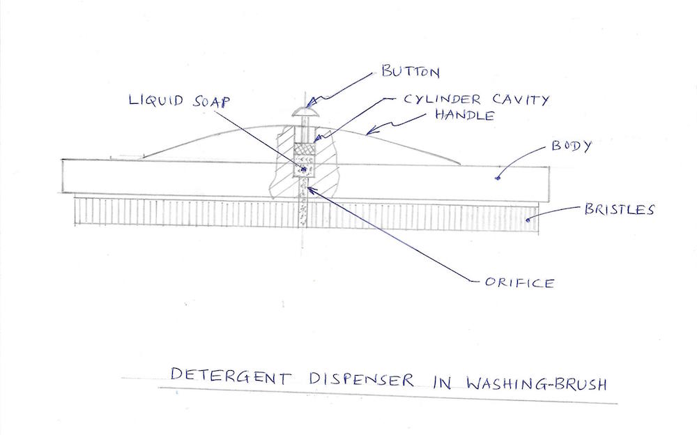 Hand washing brushes are used in any household to scrape away dirt and blemishes on the surfaces of clothes, generally after applying liquid detergent/soap cake on the clothes. By incorporating a liquid detergent dispenser onto a hand washing brush, the task of scraping dirt/blemishes is greatly reduced ( Ref. fig.) A gentle push on the dispenser button will inject a blob of liquid detergent onto the surface of the cloth. This can be used, where quick and effective washing of clothes is desired, without the need for pre-soaking.
