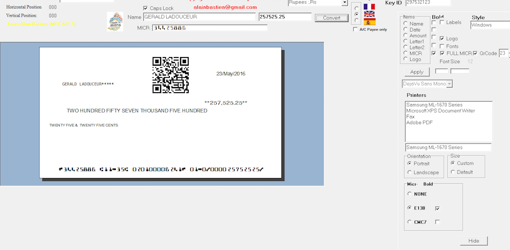 I have developed an application which fills in a check with the whole MICR line and all details on the check.
