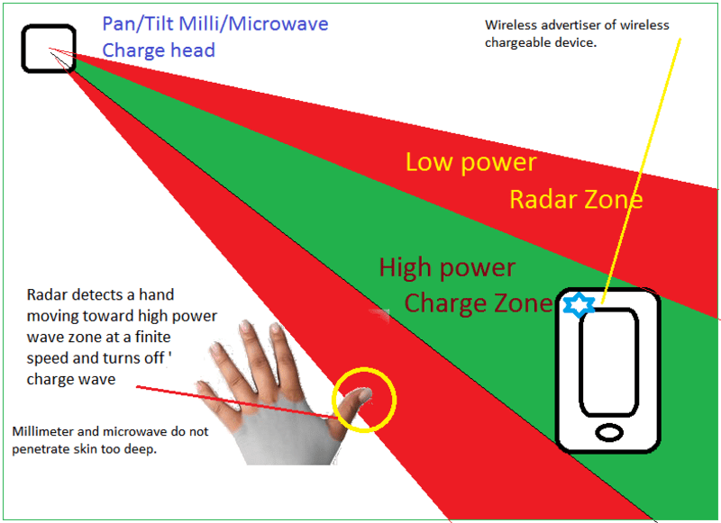 The charger device pans and tilts to maximize this signal. The charging millimeter or microwave charging wave is heavily directional to limit charging beam spread. The beam is also kept time adapt-ably low duty cycle enough to not cause serious burns in case of human skin contact except slight warming to move away from zone.