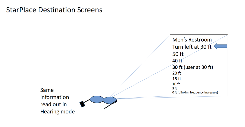 For both modes, a Pointer gives directions via earpiece and on screen, triangulating the orientation of the user referenced to North and basing a change in direction via AG or mobile device accelerometers already incorporated. Access to specific Destination is via taps on the AG or touch on computing device to scroll through Destinations; Each Destination would enunciate itself, for example, “Men’s Restroom – twenty feet, fifteen feet, etc,” a voice countdown for Hearing mode and visual countdown for Visual mode. Either mode could be enabled to automatically enunciate all Destinations, or groups such as restrooms, entrances, emergency exits, etc, or to exclude some.