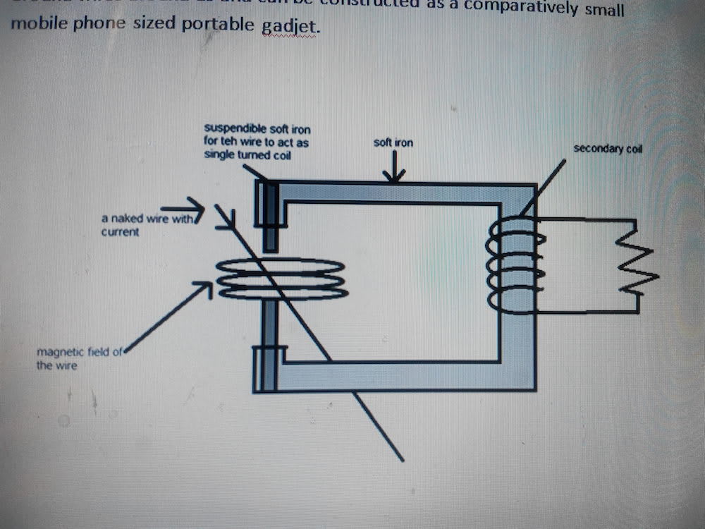 Today, the world around us is full of all sort of wirings with electricity flowing in them and hardly is there some place in the civilized world where we can’t find it. We know that all wires through which electricity flows have magnetic lines of force around them. At many places we use these magnetic lines of force for producing mechanical energy or vice versa; that is, we use mechanical energy to produce magnetic lines of force with the help of magnets to produce electricity. In this project the magnetic lines of force of the wiring that surrounds us can be used to create electricity without too much cost. In a transformer electromagnetic induction helps to transfer current from primary coil to the secondary coil by the magnetic lines of force but here we can directly extract the current through any wire with electricity flowing in it with the use of the magnetic lines of force which could in turn create a magnetic field around the secondary coil and induce current in it. The device could be constructed as in the figure where this naked wire could be used from any current carrying one. As the efficiency of transformer is highest of all devices known to us we could further create a set up wherein the number of turns of primary as well as the secondary coil could be adjusted from outside to utilize our desired voltage; maybe not always and not to power heavy electronics but enough to charge phones or other small stuff.