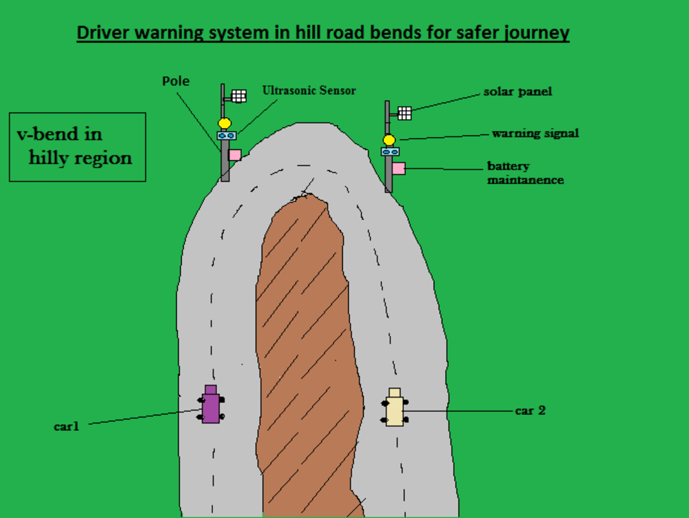 Two poles are placed at the ends of the curve in hill bends. Ultrasonic sensors are fixed on each pole. Ultrasonic sensor senses the incoming vehicles towards the pole and sends information to Arduino UNO controller board. Warning signal lights are fixed to each pole connected with Arduino UNO controller board. Arduino UNO makes the warning signal glows brighter according to the program, when the vehicles approach near to the bend in hill road.